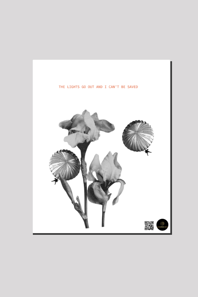 Elevate your space with this breathtaking 16×20-inch canvas print, featuring a mesmerizing black-and-white floral design with two tiny parachutists drifting beneath towering flowers. Inspired by the haunting lyric “The Lights Go Out and I Can’t Be Saved,” this artwork captures the feeling of surrender and beauty in the unknown, making it an emotional and thought-provoking centerpiece for any room.