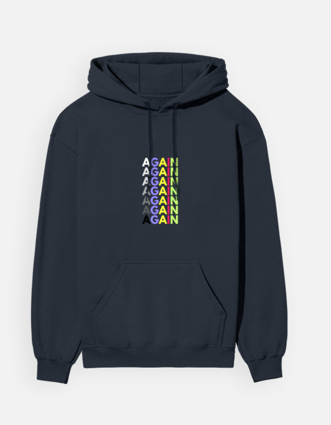 Wear your drive, even on the chilliest days. This “AGAIN” hoodie is more than a statement—it’s a mindset. Featuring a stacked, colorful “AGAIN” print, it’s perfect for those who show up and push forward, again and again.