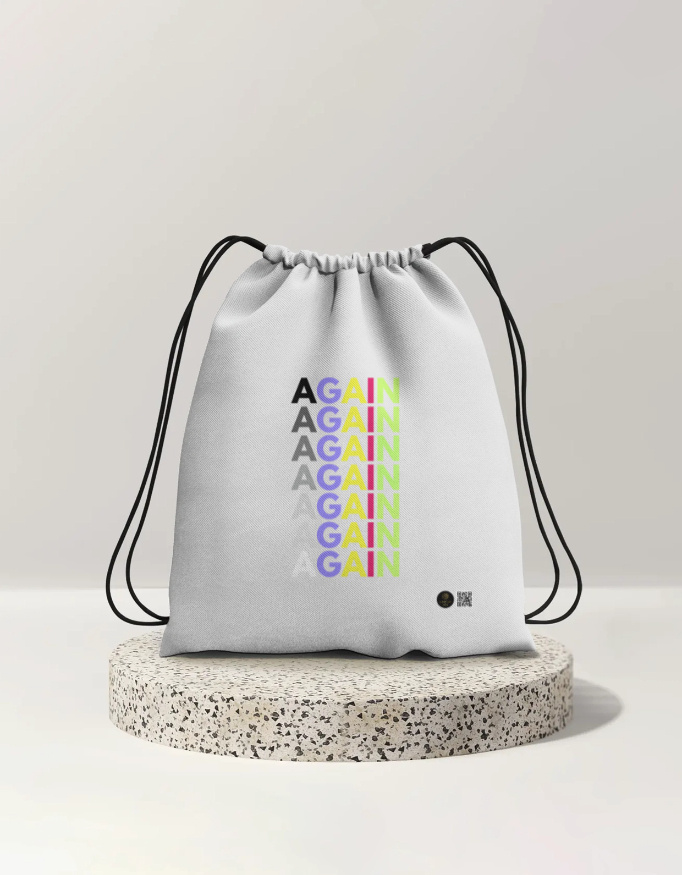 The “AGAIN” typography drawstring bag is designed for movement, style, and sustainability. With bold repetition art on a sturdy cotton canvas, this everyday bag is perfect for gym sessions, errands, or casual outings.