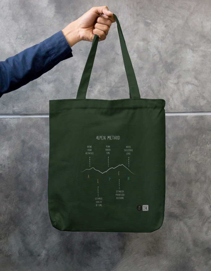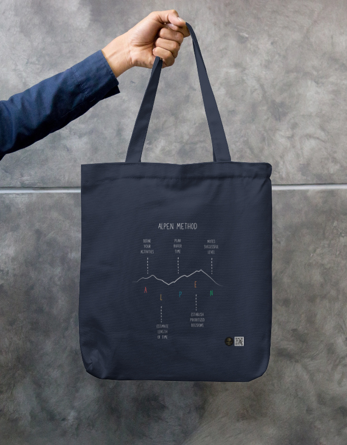 Design: Features the Alpen Method productivity graphic. Double-stitched for durability with long handles for comfortable carry.
