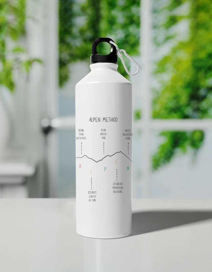Stay inspired and hydrated with the Alpen Method Sipper Bottle, crafted from premium 750 ml aluminium with a sleek glossy finish for durability and style. Featuring a unique fade-proof print of the Alpen Method—a proven time management technique—it serves as both a practical hydration companion and a daily reminder to stay organised and focused. The eco-friendly clip cap ensures easy carrying, making it perfect for active lifestyles. Designed to be lightweight, reusable, and long-lasting, this bottle is ideal for the gym, office, outdoor activities, or simply keeping hydration close at hand throughout your day. A sustainable and motivational choice for everyday use.