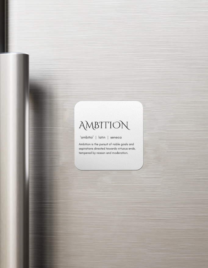 Design: Square shape with a strong magnet back – adheres securely to metal surfaces while showcasing a refined “Ambition” definition print.