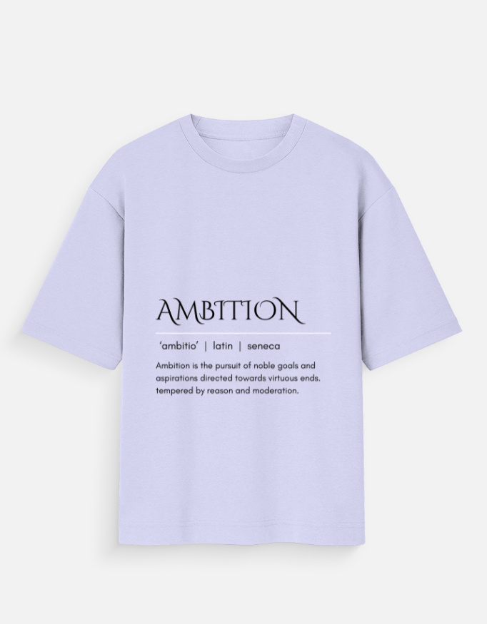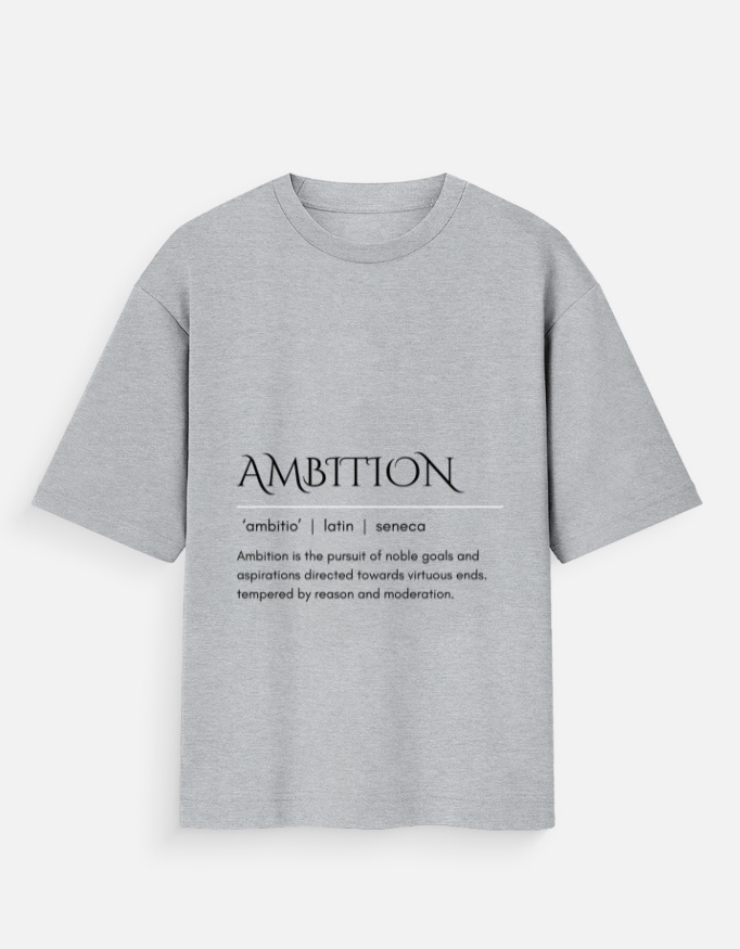 Step into purpose with the Ambition oversized t-shirt. Made from 100% premium cotton (180 GSM), it offers a structured yet breathable drape. The front print, inspired by Seneca, defines ambition as the pursuit of noble goals guided by reason and moderation—an everyday reminder to stay driven with balance. Designed with an oversized unisex fit, it features extended length and sleeve drop for a relaxed, stylish silhouette. Easy-care fabric: wash inside-out in cold water, dry on low heat, and iron inside-out to preserve the print.