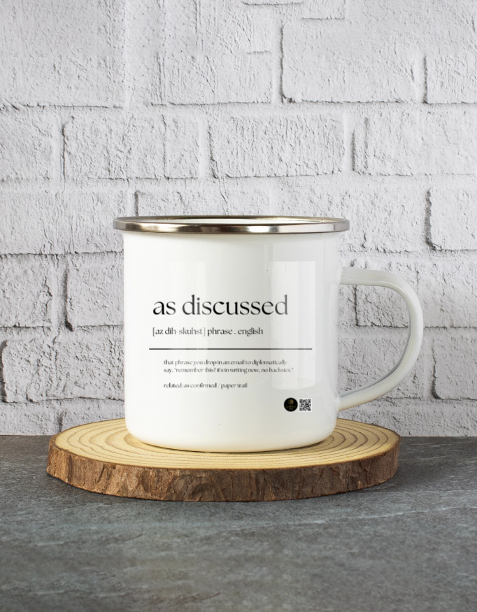 Put office diplomacy in a cup with this “As Discussed” definition coffee mug. A witty spin on the phrase that locks in agreements via email, this mug is perfect for professionals, remote workers, or anyone fluent in corporate speak. Ideal for daily coffee, late-night deadlines, or as a cheeky coworker gift.