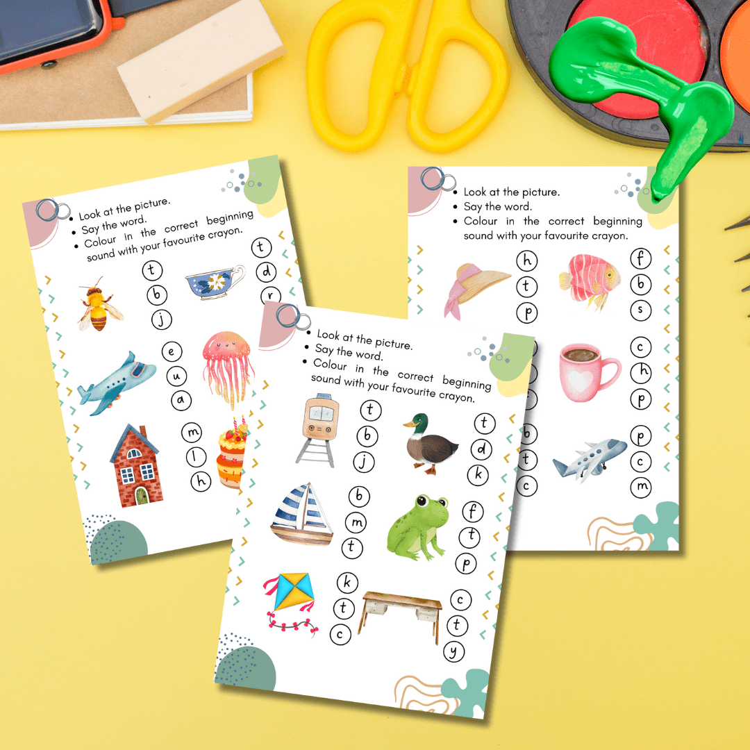 Introduce your preschooler to the world of phonics and letter sounds with this set of 10 exciting activity sheets. Each A4 worksheet is designed to help children recognize beginning sounds through a fun and engaging approach. By looking at pictures and colouring in the correct beginning letter, children will develop essential literacy skills while also enjoying creative play.