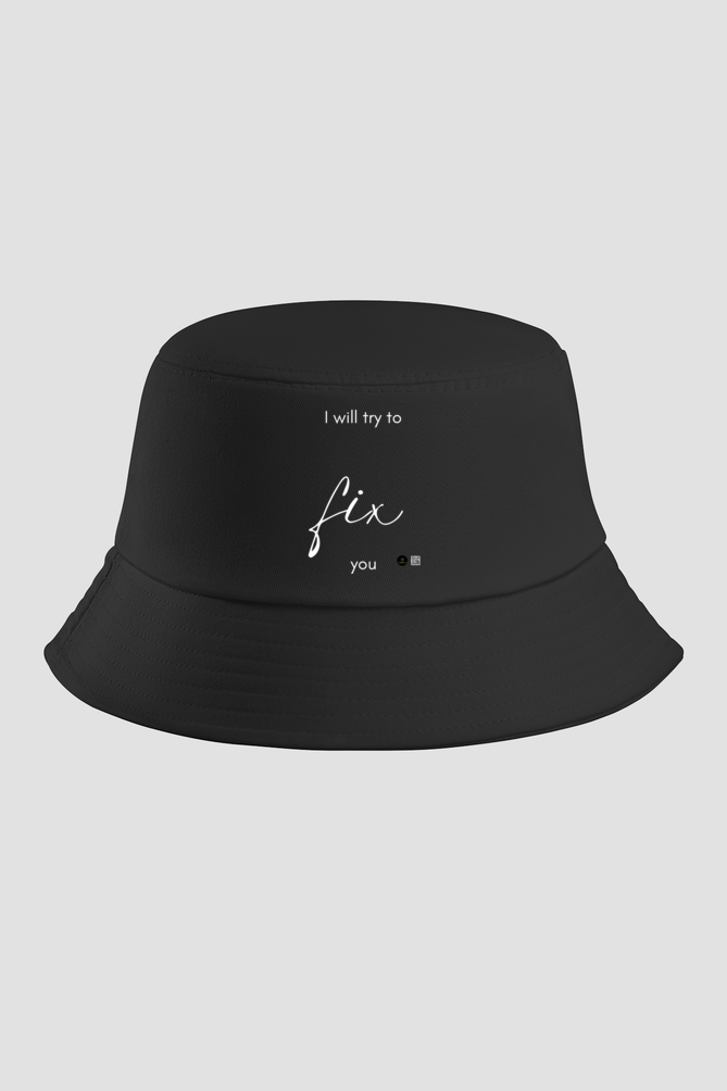 Complete your look with this stylish black bucket hat, featuring the iconic Coldplay lyric “I Will Try to Fix You,” with “Fix” boldly emphasized for a striking yet meaningful design. Whether you’re a die-hard Coldplay fan or simply love music-inspired fashion, this bucket hat adds a trendy, effortless touch to any outfit.