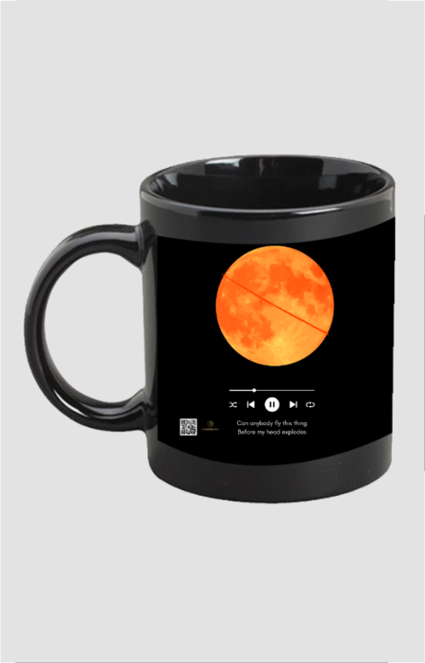 Start your day with a touch of music and mystery with this 11oz black coffee mug featuring the “Can Anybody Fly This Thing Before My Head Explodes” design. Inspired by Coldplay’s poetic lyrics, this mug showcases a striking red moon with a music-playing track, making it an ideal pick for music lovers, dreamers, and celestial admirers.