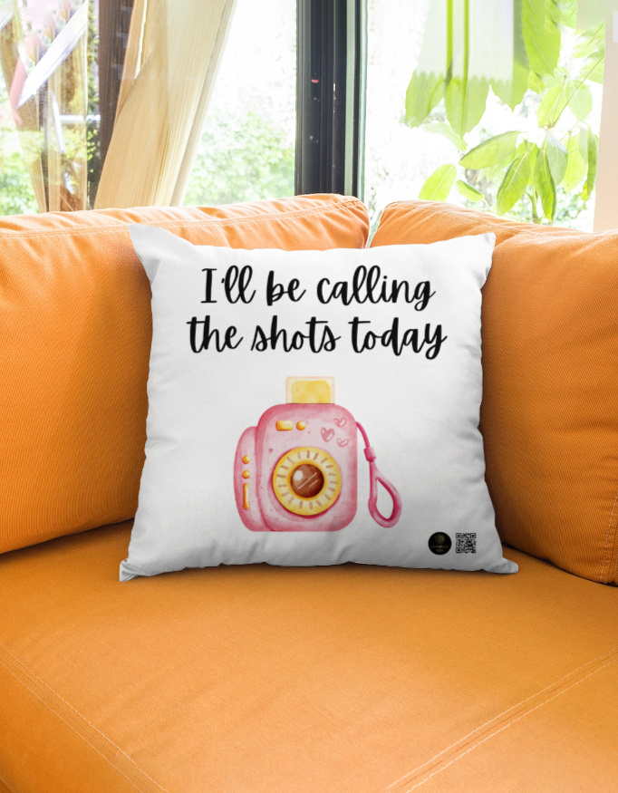 Add a splash of personality to your space with this stylish cushion cover featuring a vibrant camera illustration and the phrase “I’ll be calling the shots today.”