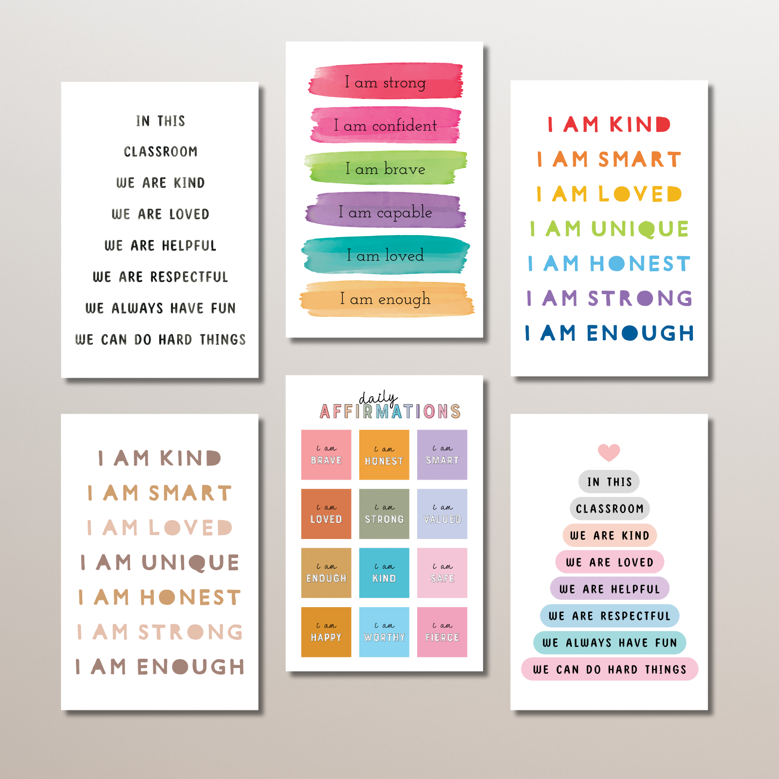 Themes include: “I Am” affirmations, Growth Mindset quotes, Classroom values, and Daily confidence boosters