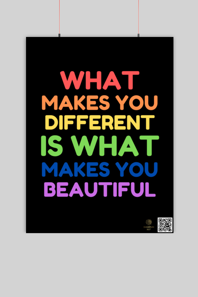 Celebrate individuality and self-love with this “Different and Beautiful” 18×24 inch poster, designed to uplift and inspire. The bold, rainbow typography on a sleek black background makes this an eye-catching statement piece for any space—classrooms, kids’ rooms, offices, and more.