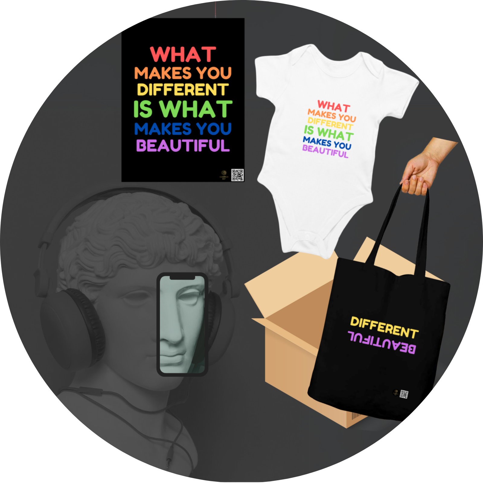 👜 Tote Bag – Stylish and durable, featuring the reversible “Different Beautiful” message for an eye-catching look.