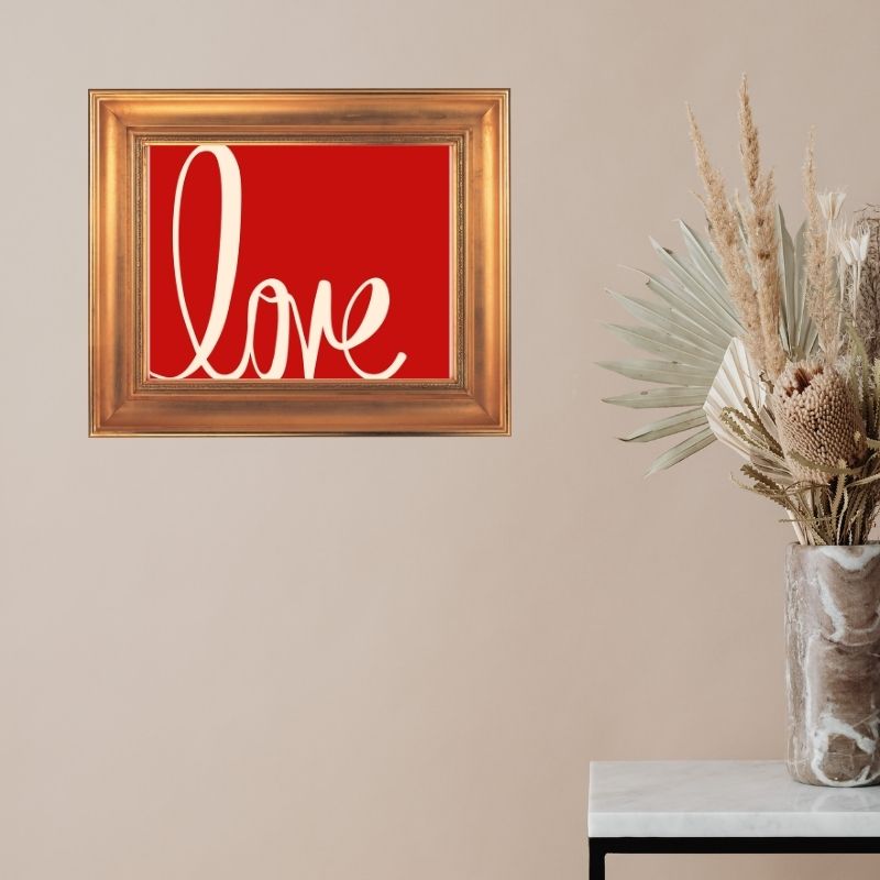 Elegant and Bold Design: The elegant script of “Love” paired with the passionate red background makes this artwork both sophisticated and bold. Its simplicity highlights the emotional depth of the word, making it a timeless expression of affection.