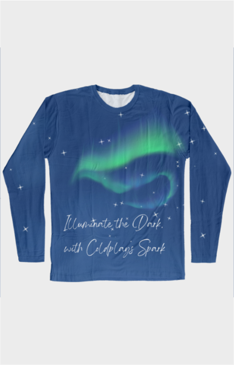 Light up your wardrobe with this stunning Female AOP Full Sleeve Tee, designed with a mesmerizing green aurora that mirrors the beauty of the night sky. The “Illuminate the Dark, with Coldplay’s Spark” message, inspired by the band’s music, adds an artistic and emotional touch to this full-sleeve top. The AOP print ensures the vibrant green aurora wraps around the entire tee, creating a truly unique and dynamic design.