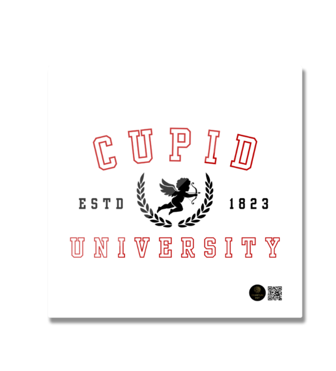 Show off your fun and playful side with this “Cupid University” magnet! Featuring a charming cupid figure and the bold text “CUPID UNIVERSITY ESTD 1823”, this magnet is perfect for adding some love and personality to your fridge, locker, or any magnetic surface. The crisp design of red and black against a clean white background makes it an eye-catching piece. Ideal for those who are in the mood to celebrate love, or simply appreciate a whimsical university theme.
