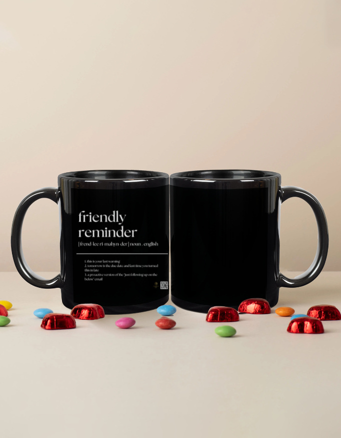 Sip with subtle authority using this “Friendly Reminder” definition mug. Perfect for office warriors, remote workers, or anyone who’s ever sent a polite-but-firm nudge, this mug blends sarcasm with practicality. A witty addition to your desk or a clever gift for coworkers who love corporate humour.