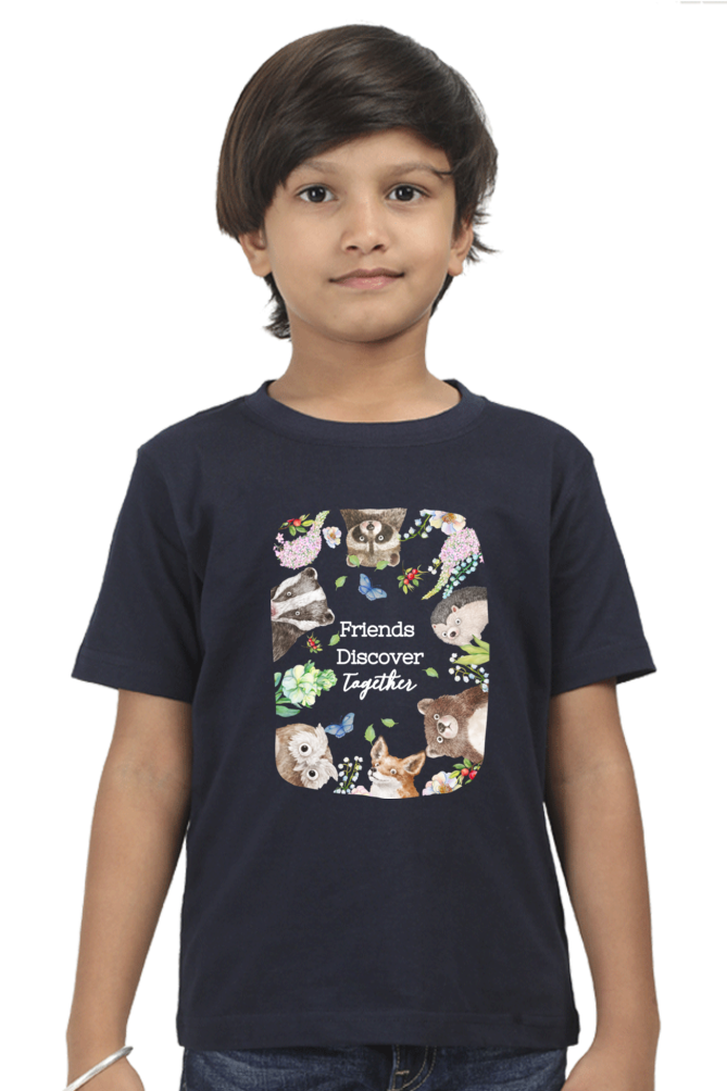 Friends Discover Together Boys T-Shirt – Dark Edition | Cute Woodland Animal Print | Adventure & Nature Tee