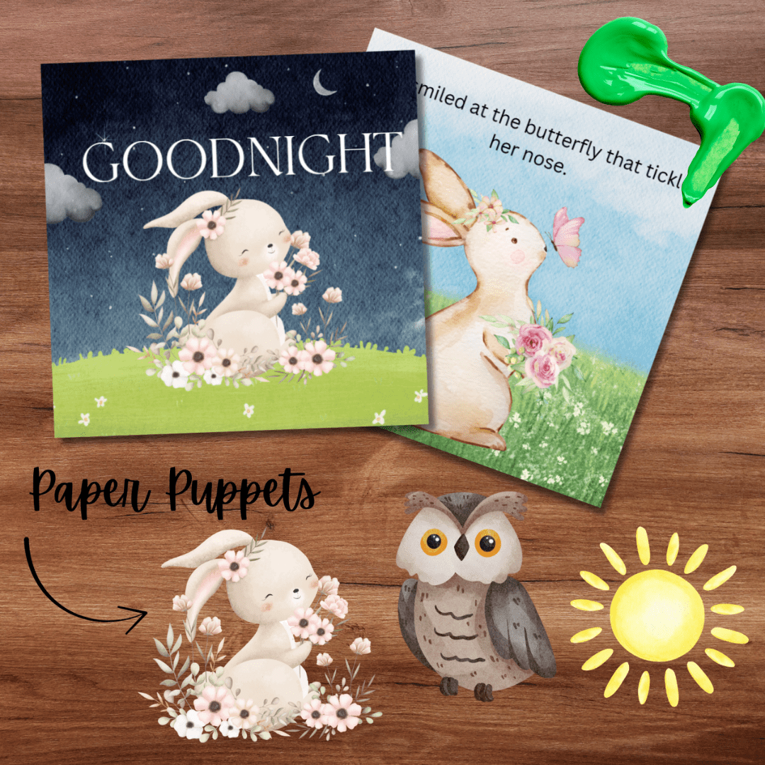 This storybook set includes 6 beautifully illustrated pages and adorable paper puppets (Bunny, Owl, Sun) that children can use to retell the story, express feelings, or roleplay sleepy adventures.