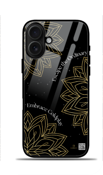 Elevate your iPhone 16 with this stunning Coldplay-inspired glass case, featuring a mesmerizing golden geometric floral design against a black starry sky background, reminiscent of constellations shining in the night. The elegant typography “Escape the Ordinary, Embrace Coldplay” adds a poetic and inspirational touch, making this case perfect for those who love music, art, and celestial beauty.