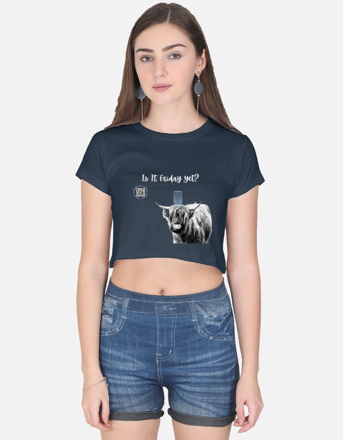 Add a touch of humour to your casual wear with the “Is It Friday Yet?” Dark Crop Top. Featuring a playful highland cow print, this crop top blends comfort, style, and a cheeky attitude – perfect for everyday wear.