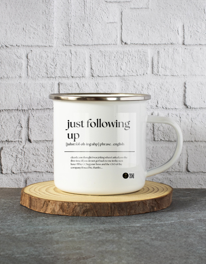 Sip persistence with style. This “Just Following Up” definition coffee mug captures the all-too-familiar workplace phrase in a witty, tongue-in-cheek way. Perfect for professionals, remote workers, or anyone who knows the art of sending “gentle reminders.” A functional and funny gift for coworkers or office friends.