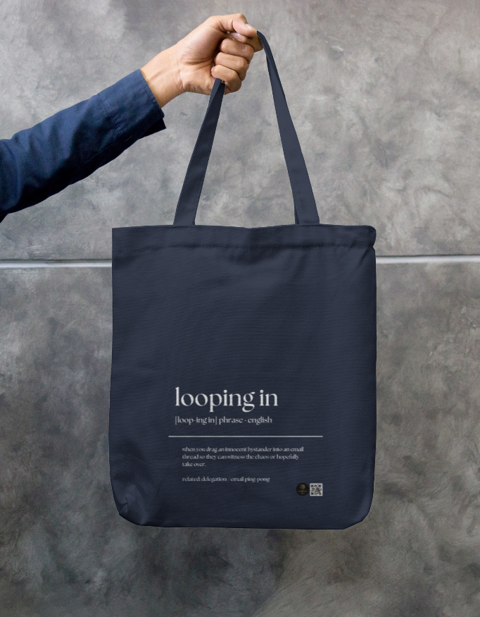 Bring humour to corporate lingo with this “Looping In” definition tote bag. Perfect for professionals, students, or anyone familiar with the art of email chains, this functional and stylish bag turns workplace jargon into a clever conversation starter.