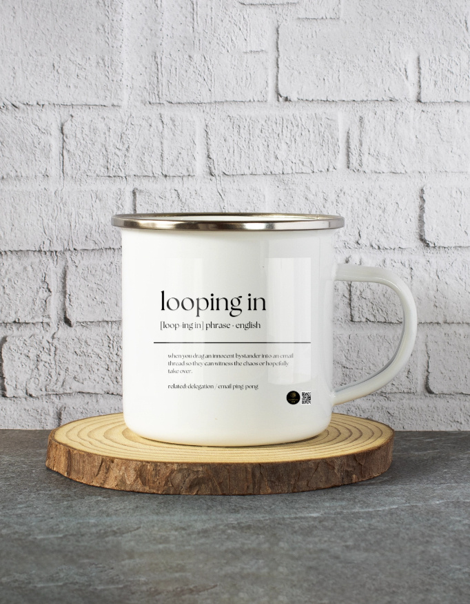 Add some wit to your coffee breaks with this “Looping In” definition coffee mug. A clever nod to email culture and corporate lingo, it’s the perfect desk accessory for professionals, remote workers, or anyone who’s ever been unnecessarily copied into a long email chain.