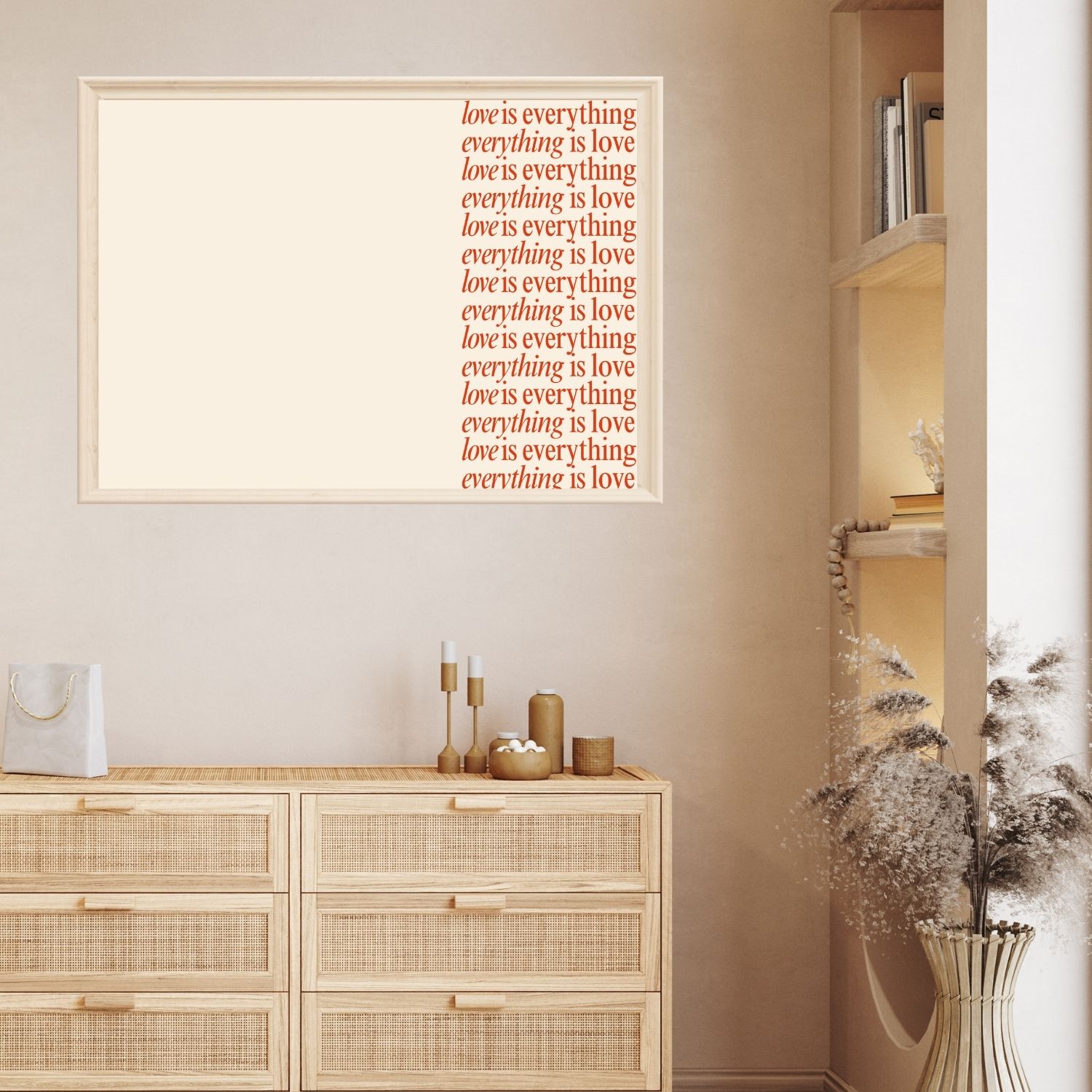 Celebrate the profound truth of love with Love Is Everything – ‘Love Is Everything, Everything Is Love’ Quote Wall Art. This striking design features the iconic quote “Love is everything, everything is love” repeated on one side, creating a balanced and impactful visual. The repetition of the phrase adds depth and meaning to the artwork, making it a powerful reminder of love’s significance in life. Perfect for those who want to fill their space with positivity, love, and inspiration.