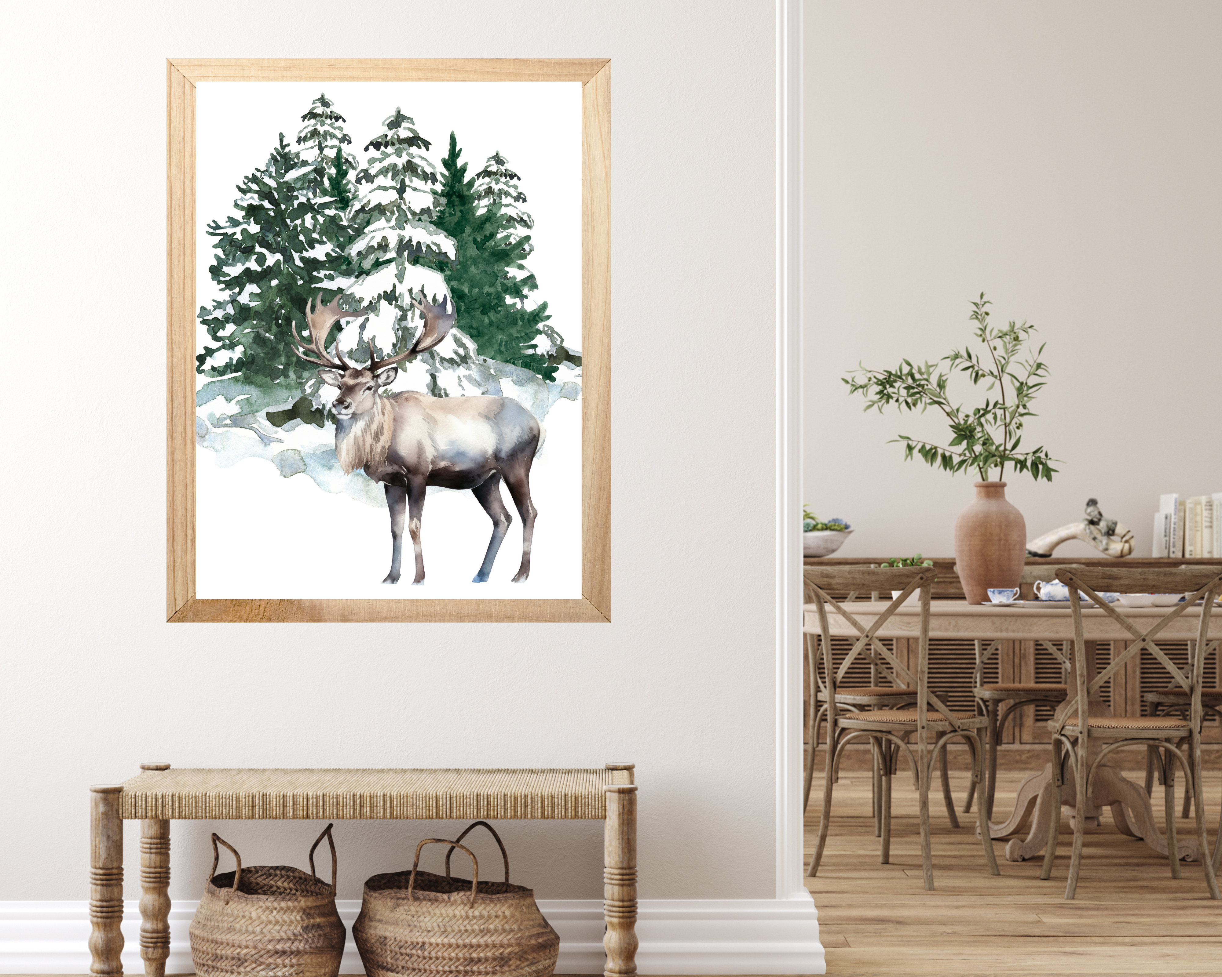 Bring the serene beauty of winter into your home with the Majestic Snow Reindeer with Big Antlers in a Snowy Forest Watercolor Wall Art. This captivating piece features a stunning reindeer, its majestic antlers reaching high, standing proudly amidst a quiet, snow-covered forest. The delicate watercolor strokes evoke a sense of peacefulness and wonder, as the reindeer appears to be a part of the tranquil winter landscape. The soft snowflakes and the cool tones of the forest surrounding the reindeer create a perfect atmosphere for nature lovers and those who appreciate the elegance of winter.