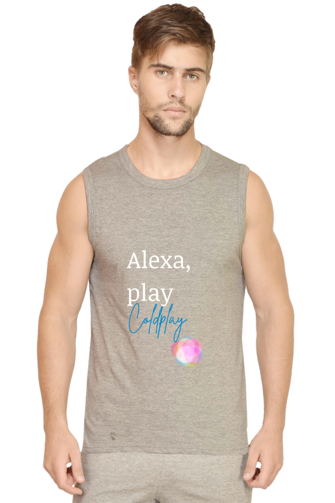 Stay cool and stylish with this music-inspired sleeveless t-shirt, featuring the phrase “Alexa Play Coldplay” alongside a vibrant, colorful ball design. Perfect for music lovers, gym-goers, and casual wear, this sleeveless tee blends comfort, breathability, and effortless style.
