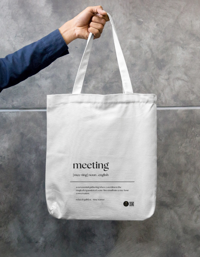 Turn corporate culture into comedy with this “Meeting” definition tote bag. A witty take on the endless gathering that could’ve been an email, this bag is perfect for professionals, students, or anyone who loves a playful jab at office life. Stylish, functional, and guaranteed to get knowing smiles.