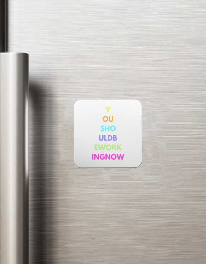 Design: Square-shaped with a high-strength magnet back. Features the bold vertical “YOU SHOULD BE WORKING NOW” message in vibrant colors – a sleek reminder to stay focused.