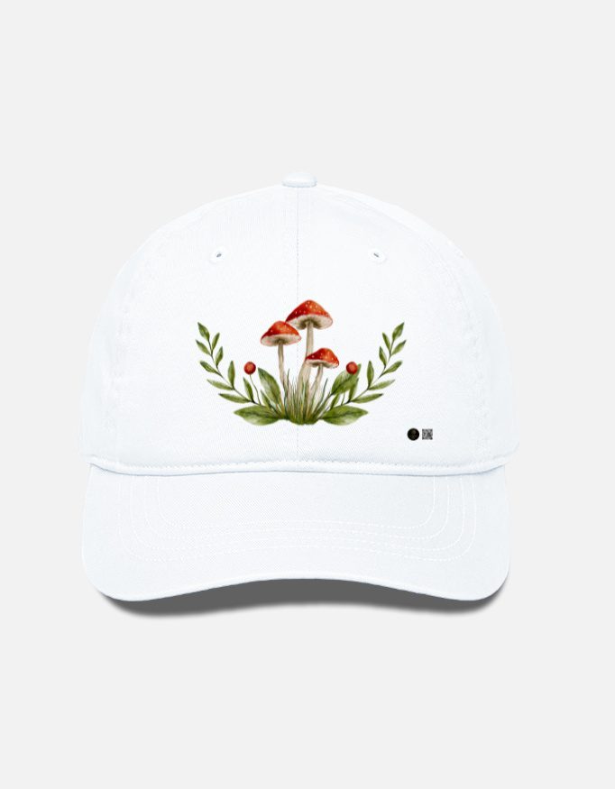 Step into the world of whimsical nature with this Mushroom Printed Baseball Cap, designed to add a soft botanical charm to your daily style. Featuring a beautifully illustrated mushroom cluster with foliage, this cap blends clean aesthetics with an earthy, artistic vibe — perfect for nature lovers, cottagecore fans, and anyone who appreciates unique accessories.