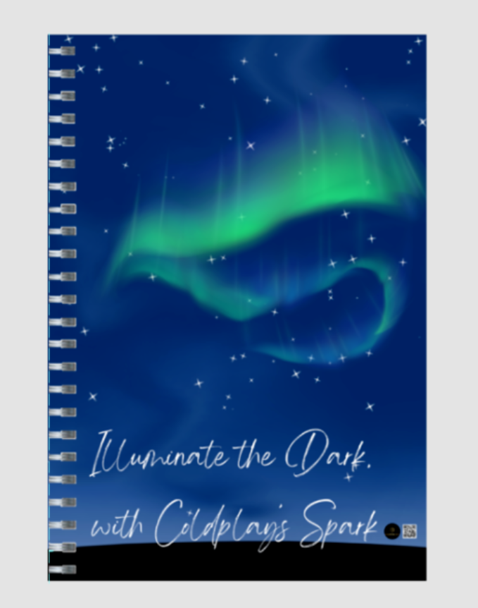 Unleash your creativity with this stunning UnRuled Notepad that combines functional design and celestial artistry. Featuring a mesmerizing green aurora set against a starry night sky, the phrase “Illuminate the Dark, with Coldplay’s Spark” is beautifully integrated into the design, making it a perfect fusion of art and music. Inspired by Coldplay’s ethereal sound and cosmic themes, this notepad is the perfect canvas for your thoughts, sketches, and ideas.