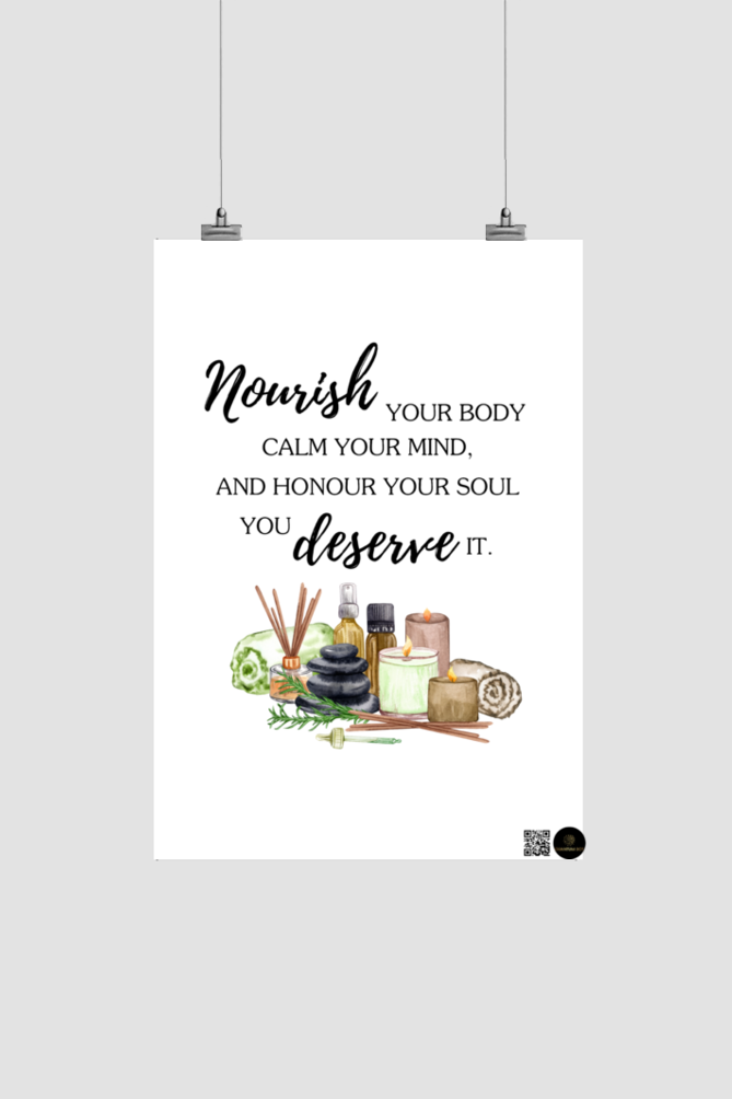 Add a soothing touch to your environment with this A4-sized “Nourish & Flourish” wellness poster. Designed with a gentle spa illustration and an empowering affirmation, this poster is perfect for your self-care routine, mindfulness nook, or therapy office.