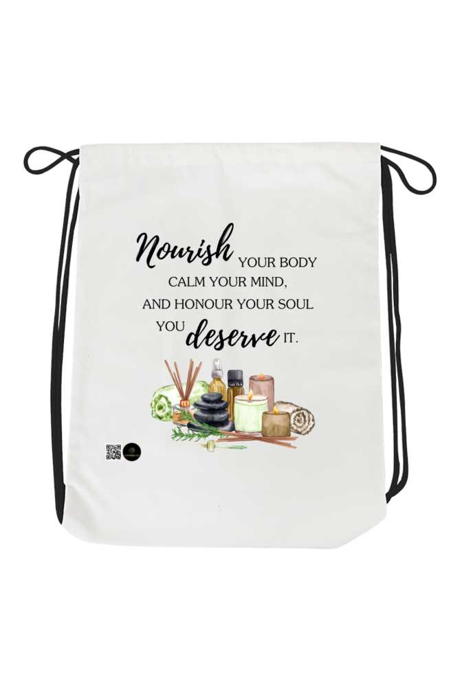Carry calm wherever you go with the “Nourish & Flourish” Drawstring Bag – a beautiful blend of style and soul. Featuring a tranquil spa-inspired design with the quote “Nourish your body, calm your mind, and honour your soul – you deserve it”, this bag is a daily dose of peace on your shoulder.