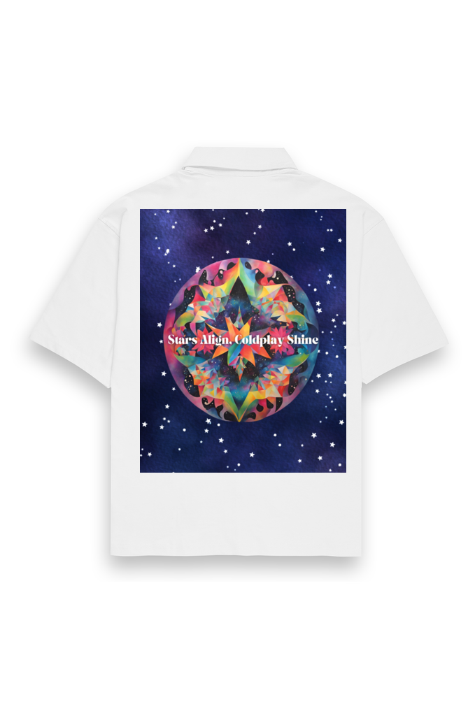 Embrace music, art, and cosmic wonder with this Coldplay-inspired oversized shirt, designed for those who believe in the magic of the stars. Featuring a striking geometric colorful circle with the words ‘Stars Align, Coldplay Shine’ set against a starry background, this shirt merges music and celestial beauty into a timeless fashion statement.