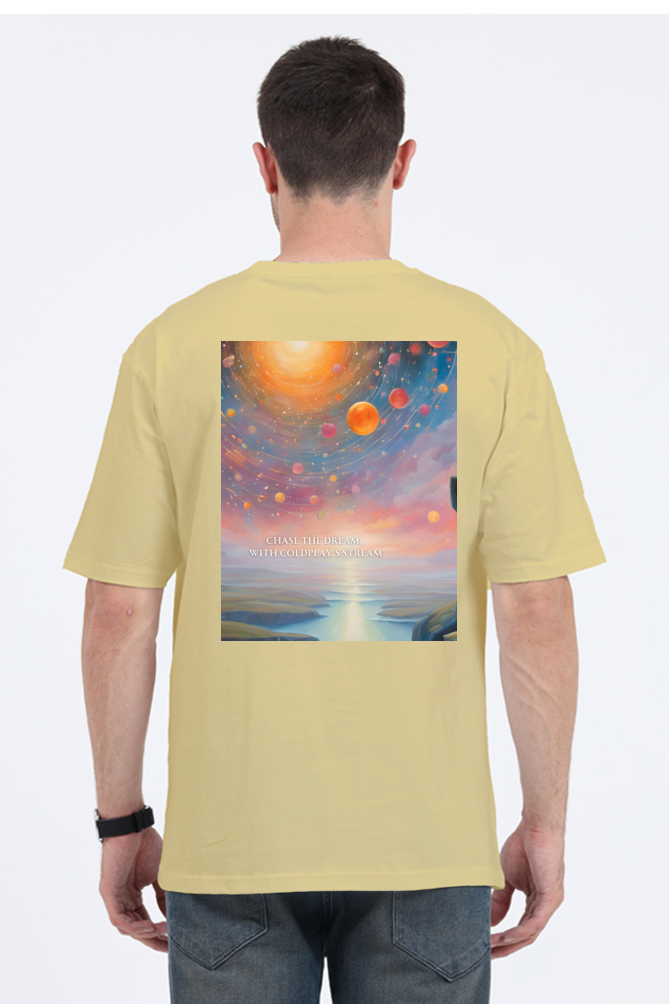 Step into a world of music, dreams, and breathtaking art with this oversized standard T-shirt, featuring a stunning painting-style illustration of a person witnessing a mesmerizing sunrise from a cliff, overlooking a peaceful sea. The phrase “Chase the Dream, with Coldplay’s Stream” sits beautifully on the design, inspiring you to follow your dreams and embrace the magic of life.