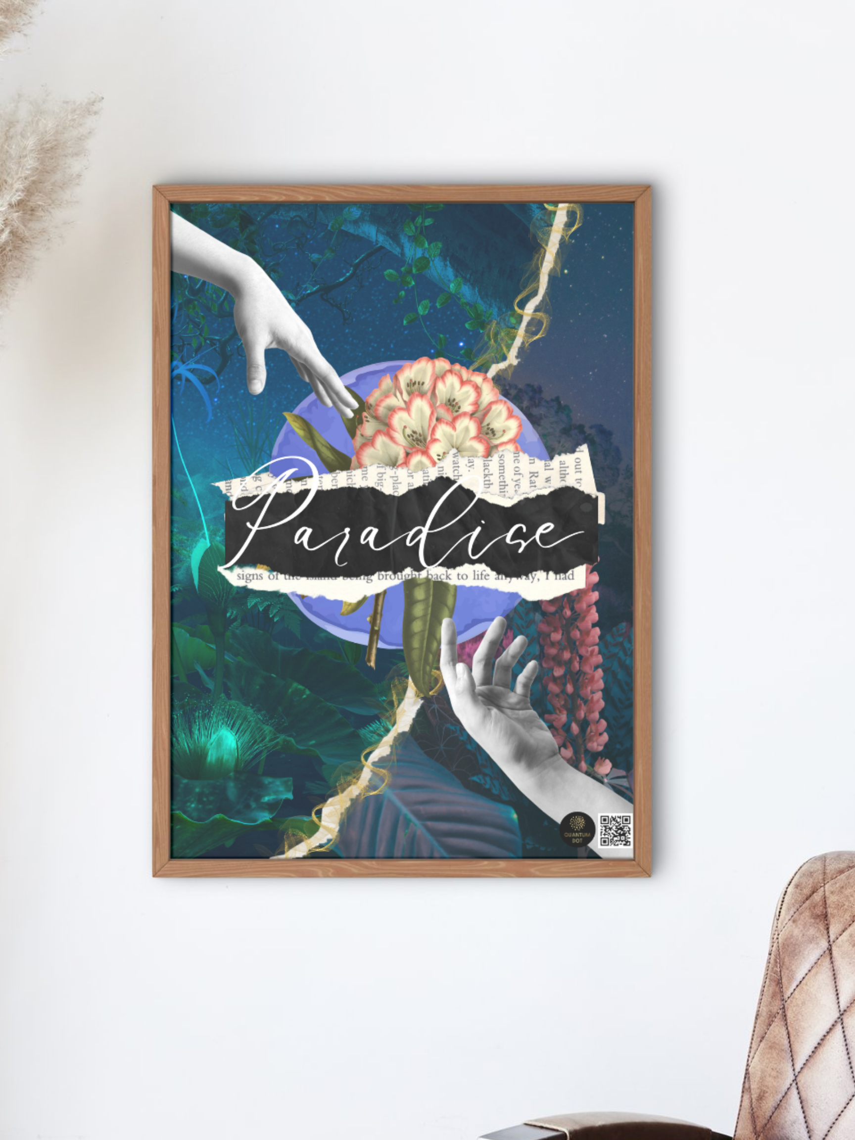 Set against a celestial backdrop of deep blues and vibrant florals, this piece blends hand-drawn elements, textured paper effects, and botanical dreamscapes, creating a layered composition of mystery and serenity. The torn typography spelling “Paradise” adds an artistic touch, embodying the raw emotions of searching for a better world beyond the horizon.