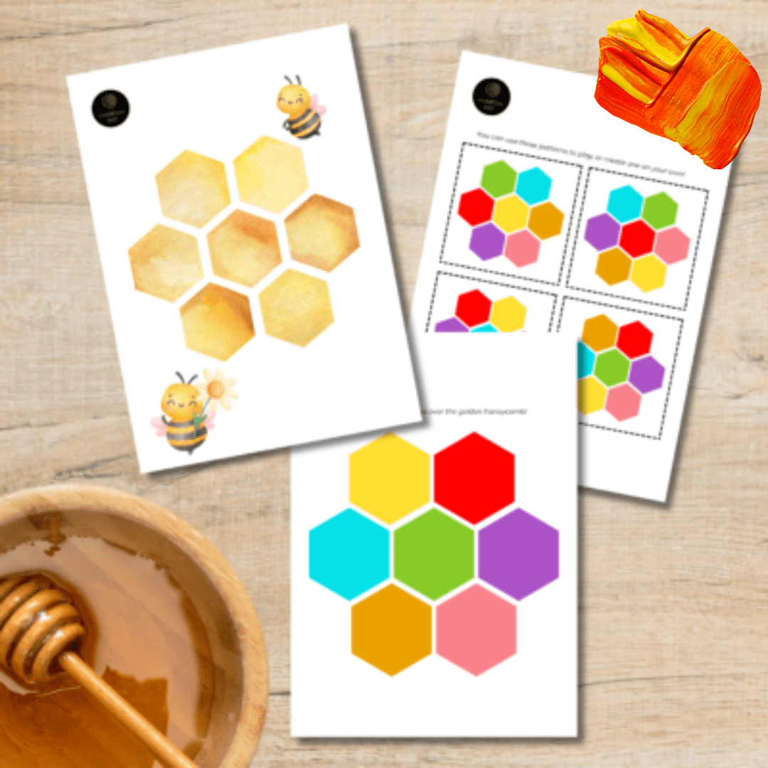 The Pattern Making Fun activity sheets are designed to help preschoolers practice pattern recognition, creativity, and fine motor skills through the engaging activity of arranging colorful hexagons on a honeycomb grid. Each printable sheet allows children to cut out hexagon shapes and use them to fill empty spaces, following preset patterns or creating their own unique designs.