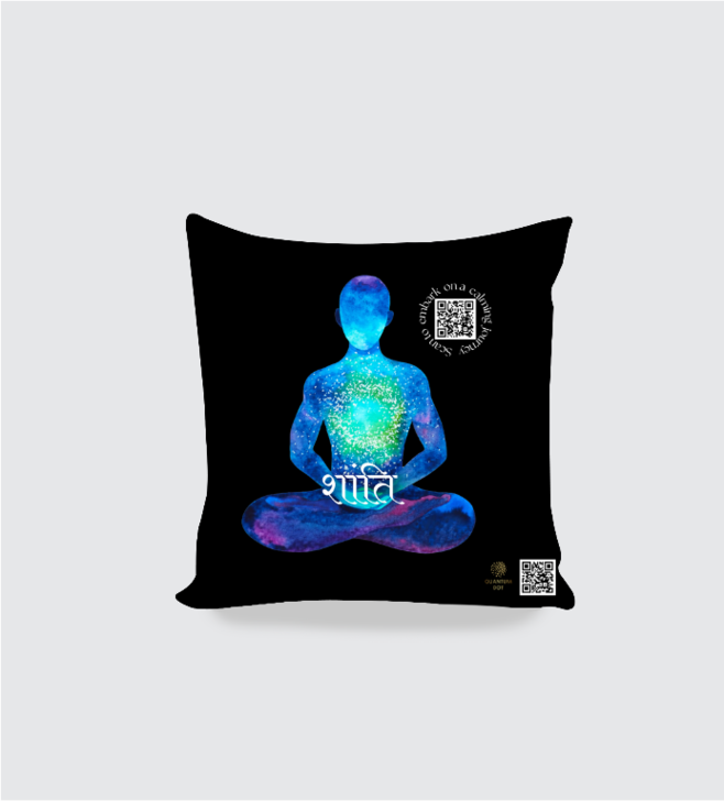 Bring tranquillity into your space with this Scan to Escape 16×16 cushion cover. Designed with a luminous meditating figure radiating cosmic energy and the Sanskrit word ‘शांति’ (Shanti), this piece adds both beauty and meaning to your home décor. A functional QR code on the corner invites you—or your guests—to pause and escape into a moment of peace with a simple scan.