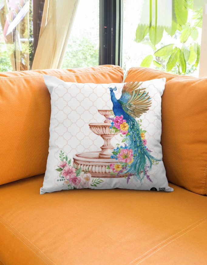 Add a touch of royalty and elegance to your home décor with this Peacock & Floral Fountain Cushion Cover, featuring a beautifully illustrated peacock perched gracefully on a vintage-style fountain surrounded by pastel florals. The light, patterned background enhances the vibrant colours of the artwork, making this cushion an instant statement piece.