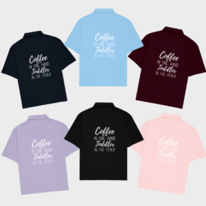 👕 Oversized Parent Shirt – Chic, relaxed fit with the relatable phrase “Coffee in One Hand, Toddler in the Other.” Ideal for caffeine-powered parents!