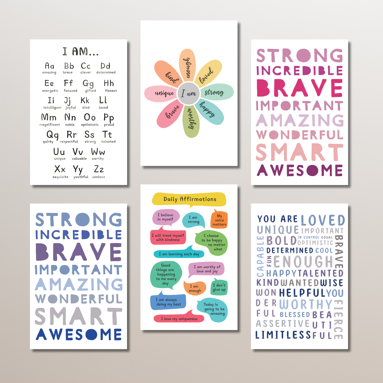 Brighten up your child’s space with this inspirational set of 6 printable affirmation posters! Designed for kids’ bedrooms, classrooms, therapy rooms, or homeschool setups, each 24×36 inch poster blends bold typography, pastel colors, and powerful self-talk prompts to foster confidence, emotional wellness, and a growth mindset.