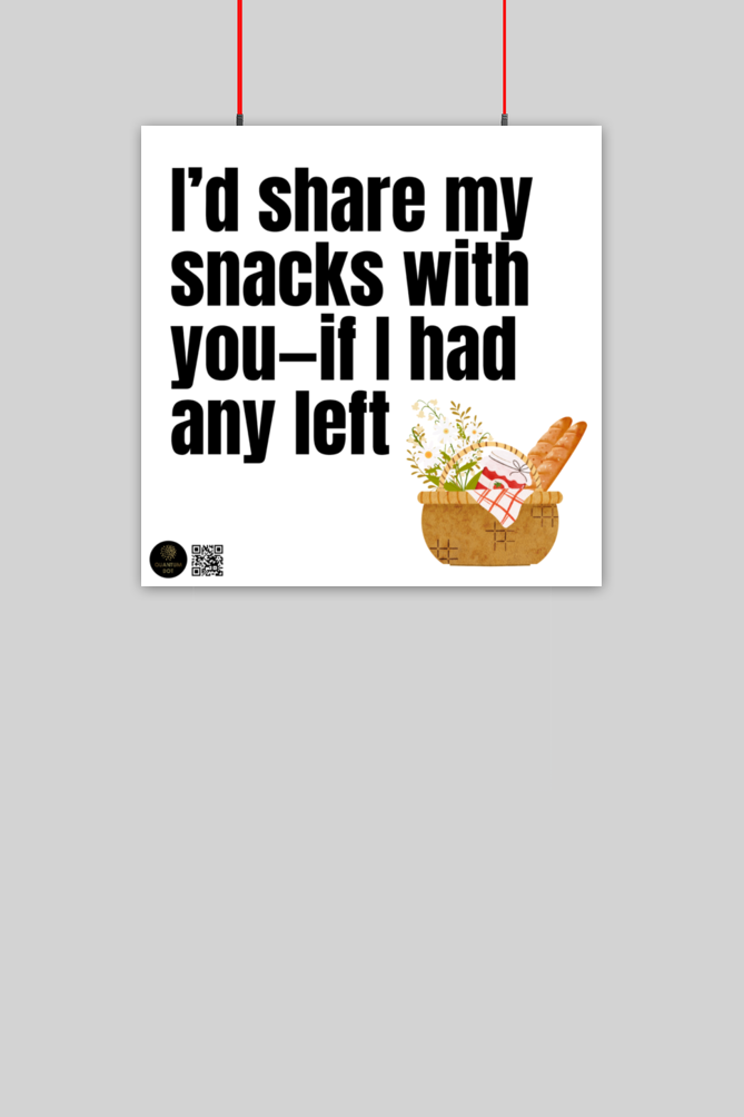 Add a touch of humor to your space with this 10×10 poster featuring the playful phrase “I’d Share My Snacks with You—If I Had Any Left,” accompanied by a charming illustration of a basket full of food. Perfect for snack lovers, office spaces, kitchens, or break rooms, this high-quality print brings fun and warmth to any setting. A great gift for coworkers, foodies, or anyone who appreciates a good laugh (and a good snack)!
