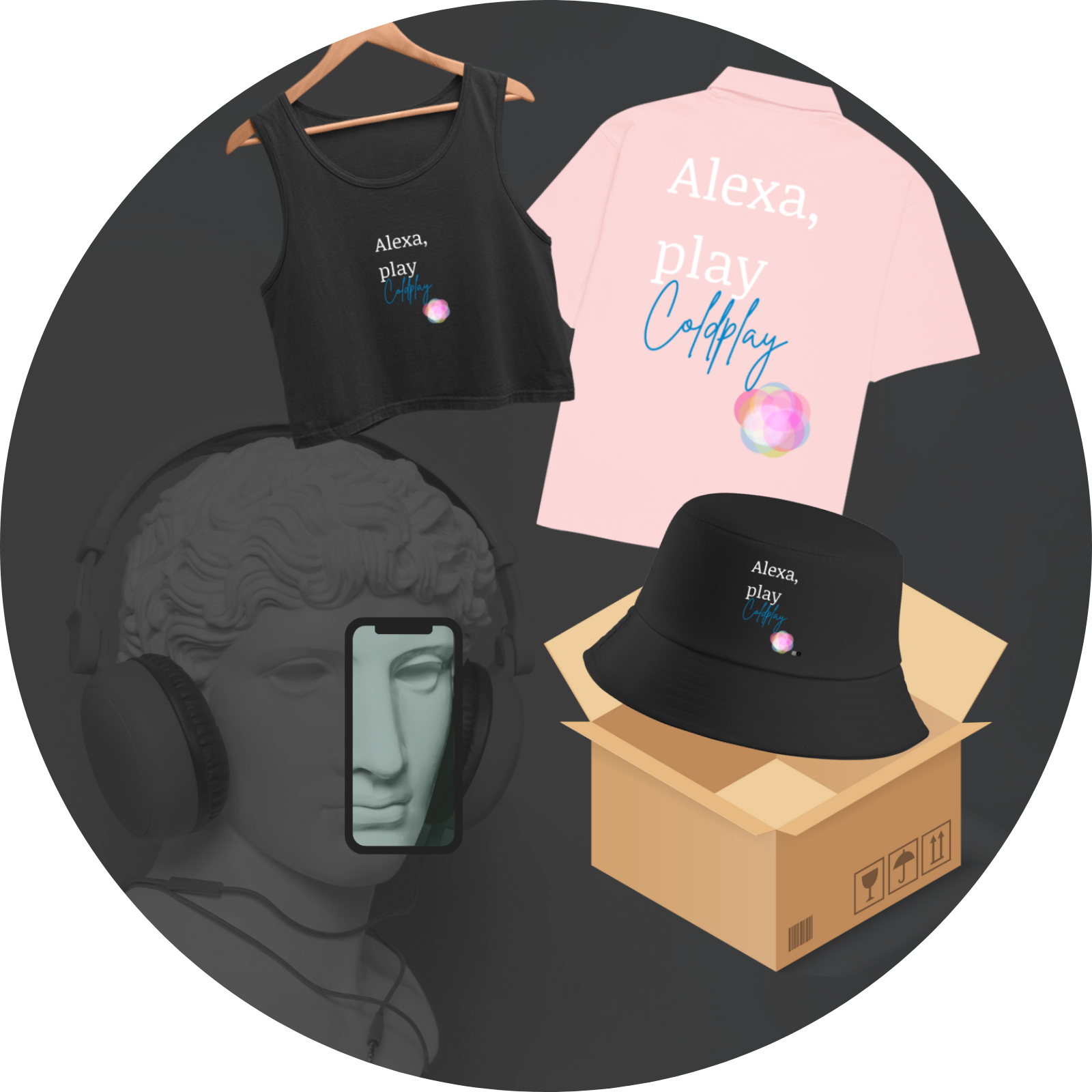 Celebrate your love for music with the Quantum Bundle – Alexa, Play Coldplay, featuring a crop tank top, oversized shirt, and bucket hat. This stylish and minimalistic collection is perfect for Coldplay fans who love effortless fashion with a musical twist.