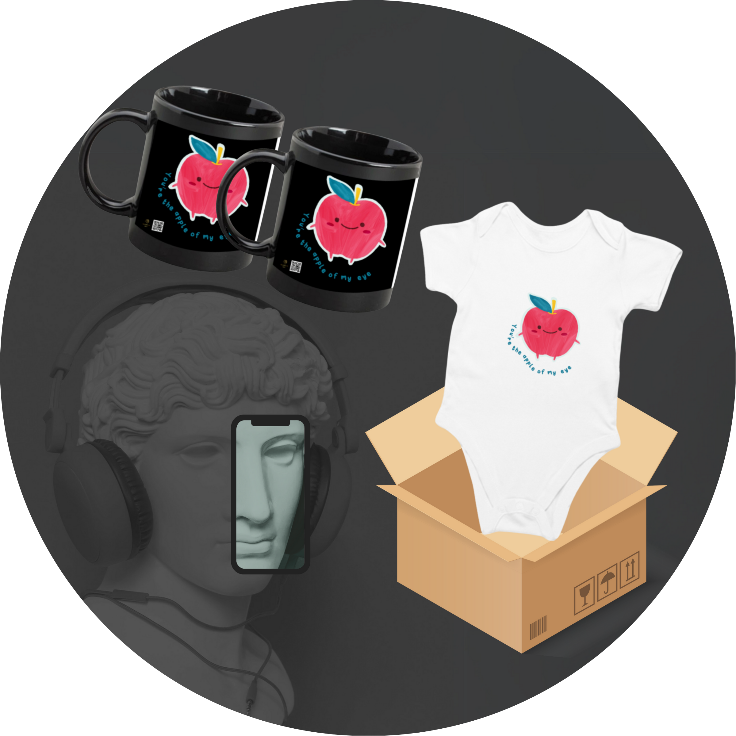 - 2 Mugs: Two black mugs featuring the adorable “Apple of My Eye” design, perfect for sipping your favourite beverages in style while embracing the sweet sentiment.