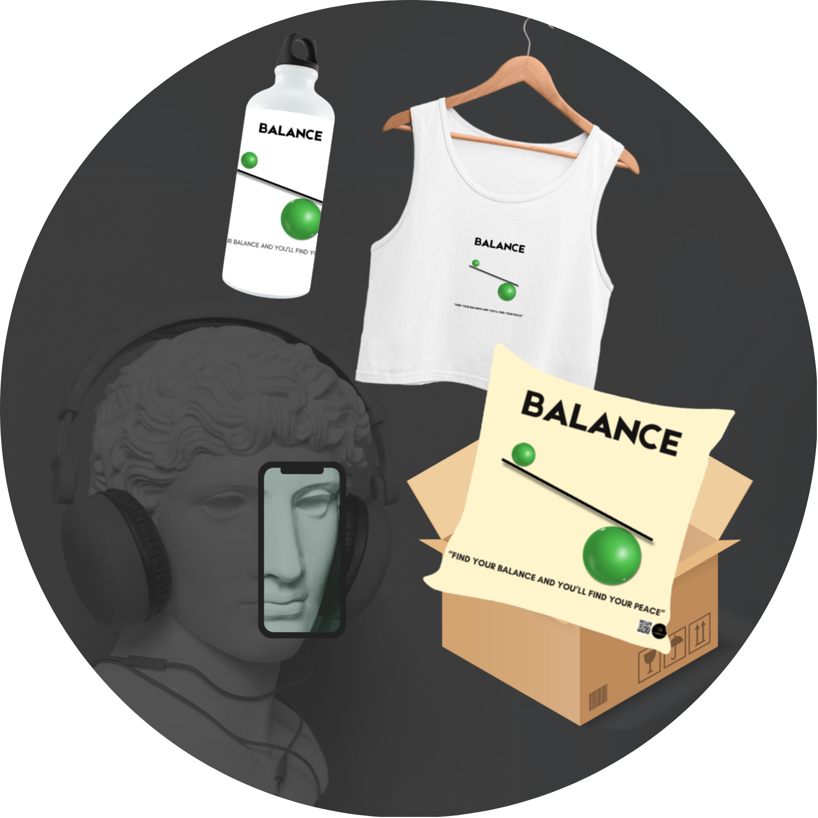 🧘♀️ Crop Tank Top – A breathable, minimalist top featuring the symbolic Balance artwork and quote: “Find your balance and you’ll find your peace.”