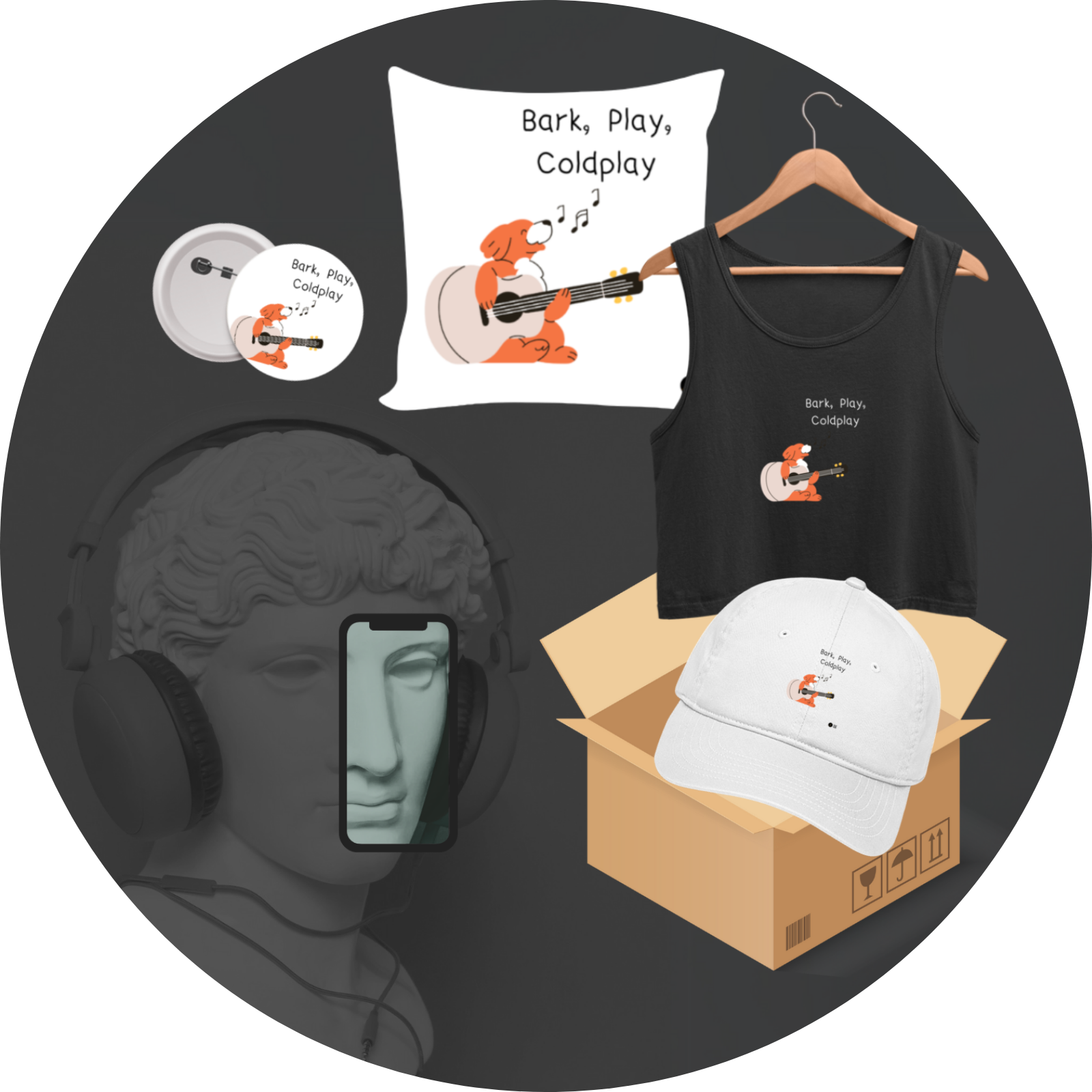 Celebrate the perfect fusion of music and playfulness with the Bark, Play, Coldplay Quantum Bundle! Featuring a cushion cover, crop tank top, cap, and a 75mm badge, this adorable collection is a must-have for Coldplay lovers and dog enthusiasts alike. The design showcases a charming dog strumming a guitar, capturing the essence of melody and joy. Whether you’re lounging at home, heading out in style, or accessorizing with music-inspired elements, this bundle is a fun and stylish addition to your collection.