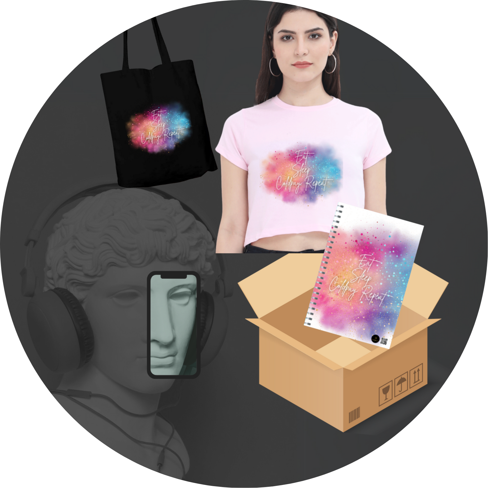 Live and breathe the rhythm of your favorite music with the Quantum Bundle – Eat, Sleep, Coldplay, Repeat. This vibrant collection is designed for passionate music lovers who want to showcase their love for Coldplay’s timeless energy. Featuring a stylish crop top, an everyday tote bag, and a spiral notepad, this bundle is the perfect mix of fashion, functionality, and creativity.