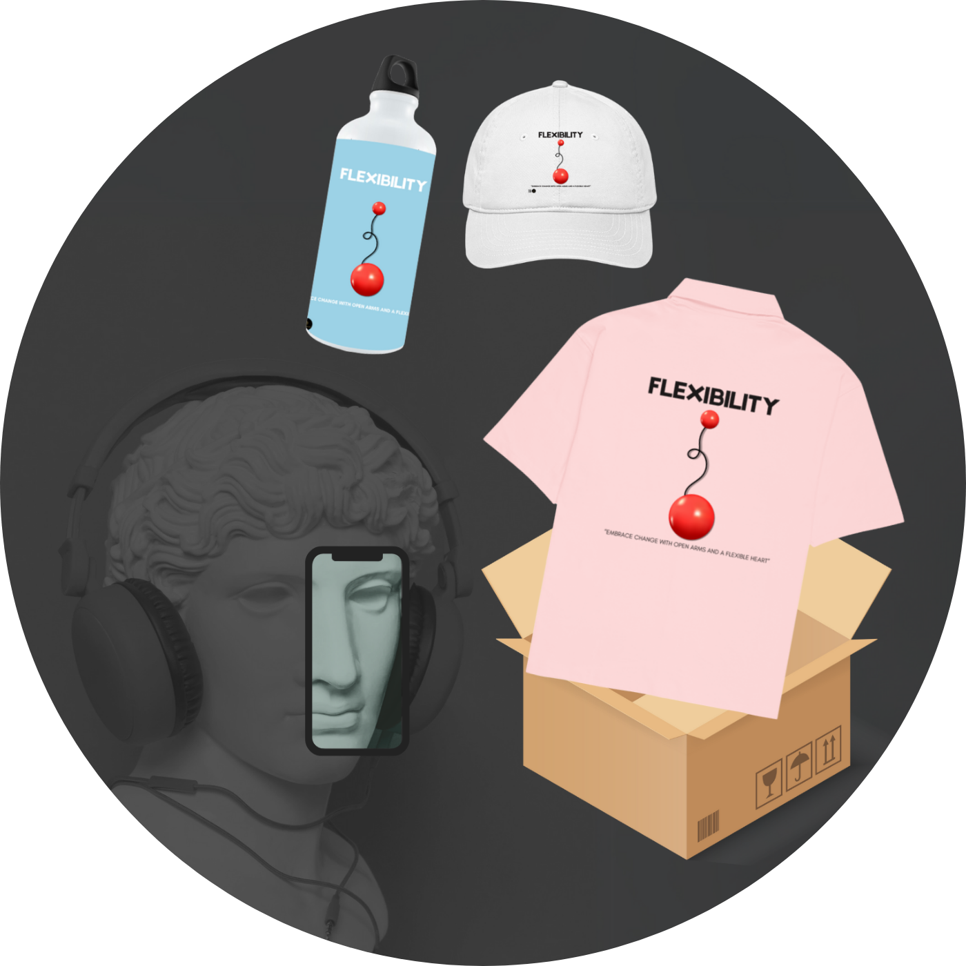 🧢 Flexibility Baseball Cap – A clean white cap with a symbolic orb graphic and the powerful message: “Embrace change with open arms and a flexible heart.”